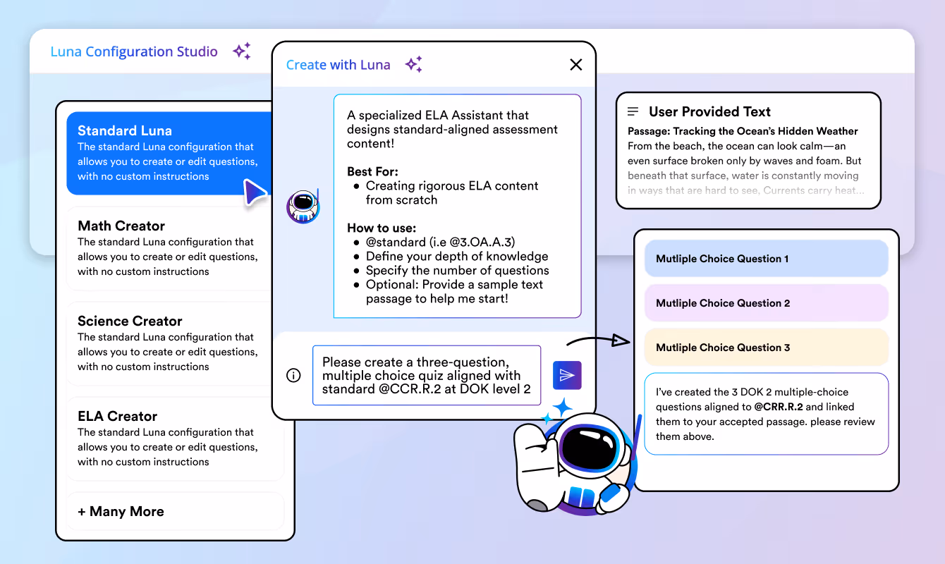 Luna is your built-in AI teaching assistant, designed to support you throughout the entire instructional journey. Whether you’re creating assessments, designing lessons, or simply exploring ideas, Luna works through direct chat or behind the scenes, powering key features to help you save time and enhance student outcomes.